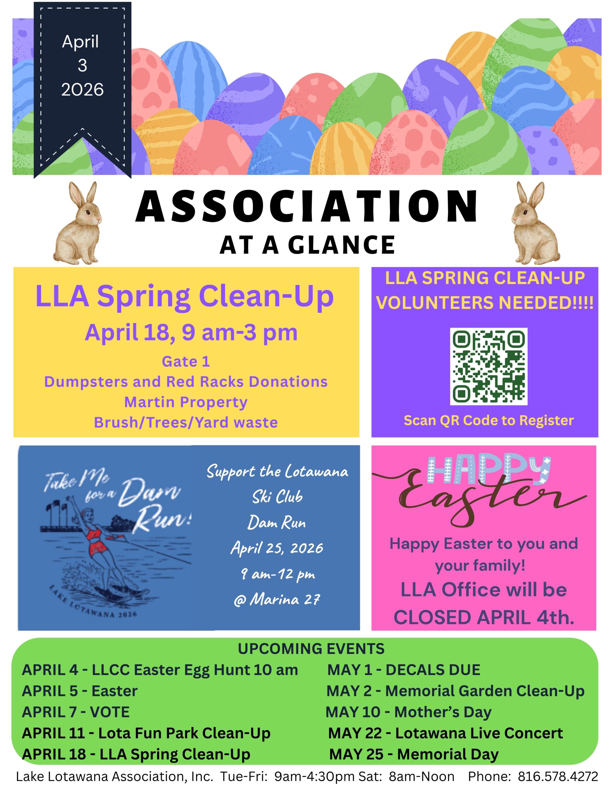 Association at a Glance-April 3 Edition / News from the Association / By Lake Lotawana Click HERE to register for the LLA Spring Clean-Up. Click HERE to sign-up for the Dam Run.