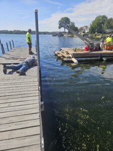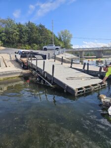 Lotawana Properties, LLC – has successfully replaced the docks at the Marina 27 with 4 new and improved docks. FYI, the old docks were pieced together mostly from the old Yacht Club docks when they replaced theirs over 5 years ago. Thank you to Spencer Brachman who did the work for us back then to move and install the donated docks. Why did the Properties LLC have to replace many have asked. The bottom line is they were becoming unsafe and requiring a lot of maintenance. The frame welds were cracking or breaking, and many of the floats no longer were doing their job. The wood decking needed to be replaced, and the wood popsicles were more maintenance than help with docking. The operations crew disconnected the sections, pulled the mud spuds and loaded the sections onto a trailer. They then hauled the sections to the Operations lot across the road for future dismantling.